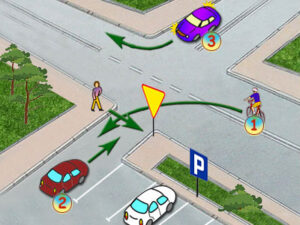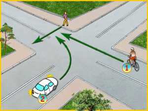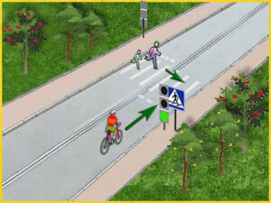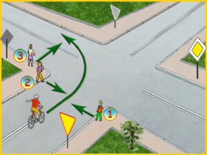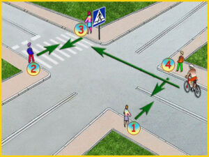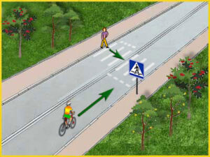 Tutaj tylko piesza nr 3 ma pierwszeństwo przed rowerzystą.