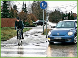 Tutaj piesi po jednej, a rowerzyści po drugiej stronie drogi, zgodnie z rysunkiem na znaku.
