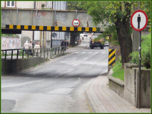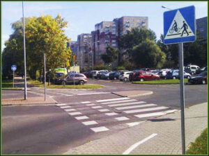 Znak wyznacza przejście dla pieszych. Obok powinien stać znak informacyjny D-6.