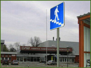 Znak ostrzega przed niedalekim przejściem dla pieszych. W obszarze zabudowanym jest to odległość do 100 metrów.