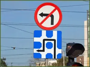 Tabliczka podpowiada jak jechać, żeby mimo zakazu jednak skręcić w lewo.